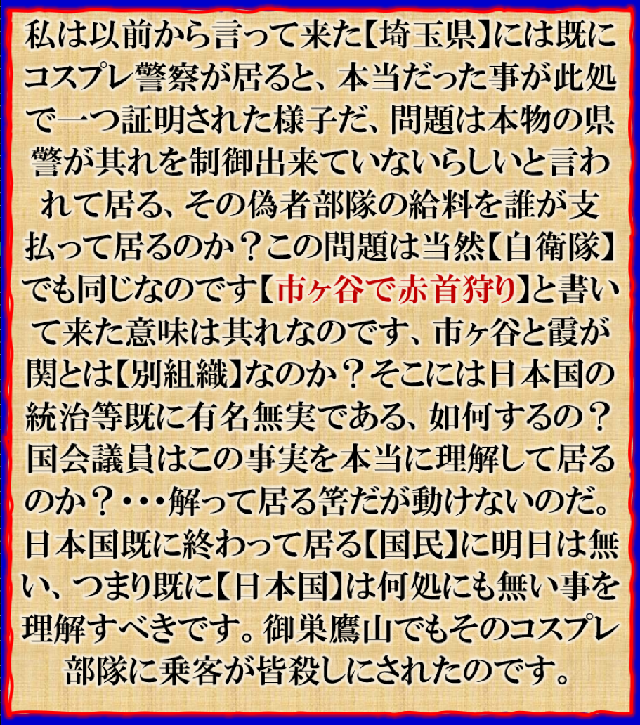 有事の際【国民】は無力です、区別が出来ない【コスプレ部隊】に全部拘束される、その先は【地獄同然】で処理される筈、御巣鷹山事変で既に実証されて居る事です、同じ手口で何時でも【事】が起きる事に成る、その前にその様な構図の日本国の【国民】は絶対に幸せは来ません、奴隷化された生活を強いられて【働け・働け・働け】と言う【洗脳】迄掛けられて、生き地獄の生活を強いられる事に成って居る、皆様の生活は今正に【ソレ】なのです、お気づきですか? sy