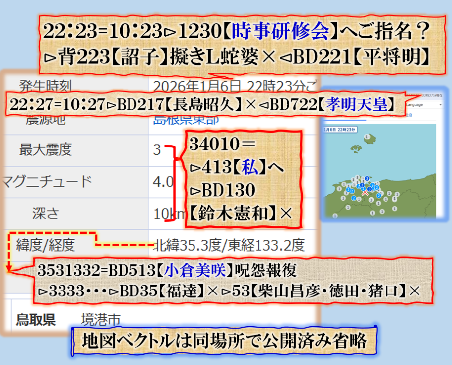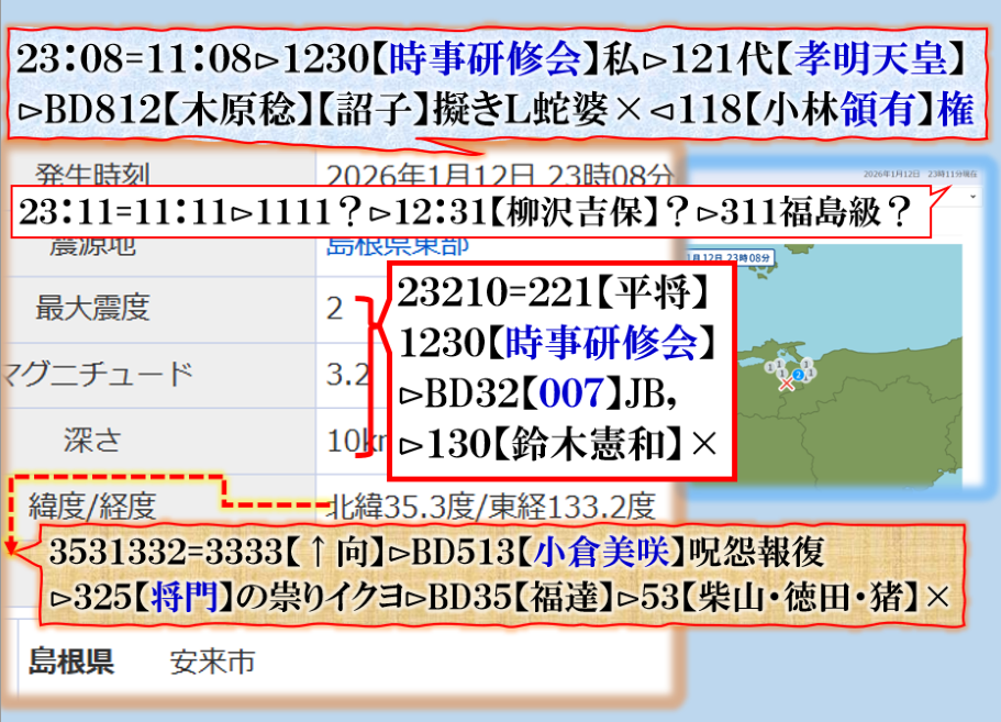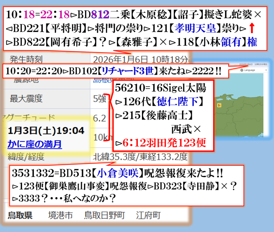 次は【釧路】【神奈川】【神流川】【高知】も危険かも知れません、何が起きるのかは解りません、地震では無いかも知れません【祟り】としての現象化が見られると言う意味だろう。今回は島根が狙いでは無い、・・・物語の【プロローグ】と理解すればよいのでは無いか???怖さが増しますよね、其れが狙いでス。 sy