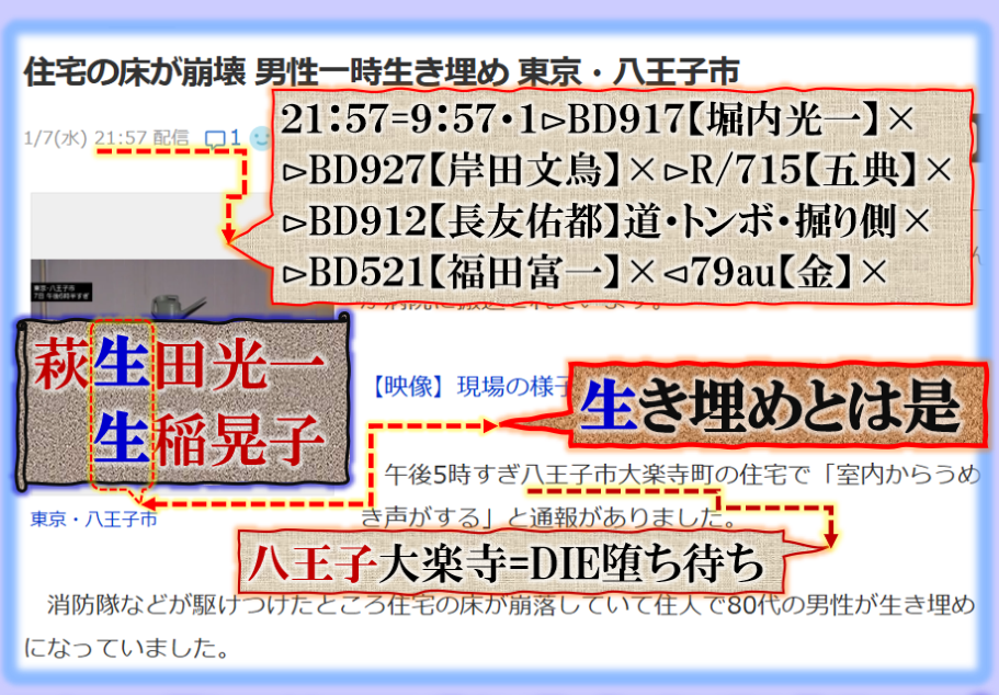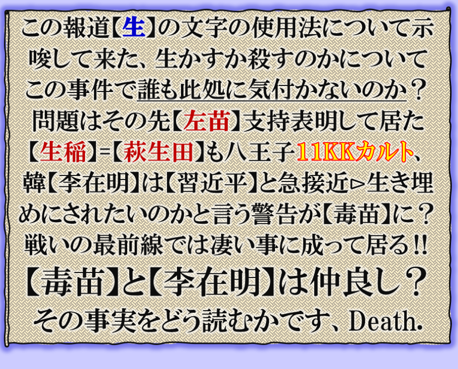 少し考えれば誰にでも理解出来る筈の【暗号化】事件です、何故生き埋めと言う表現を使って来たのか、その背景には【闘い】がある、日韓そして【11KK】カルトとの闘い、その分類で見られて居る【左苗】✖だと言う意味も含められて居る、国民は気付いて居ないのかも知れないが、【統一教会】は解散等して居ない。現政権こそそれだと言う見方を強調して来ただから【生稲:萩生田】コンビを生き埋めにするという構図で事件を仕込んだ、その事が理解出来るかどうかが国民に問われて居るのです。 sy