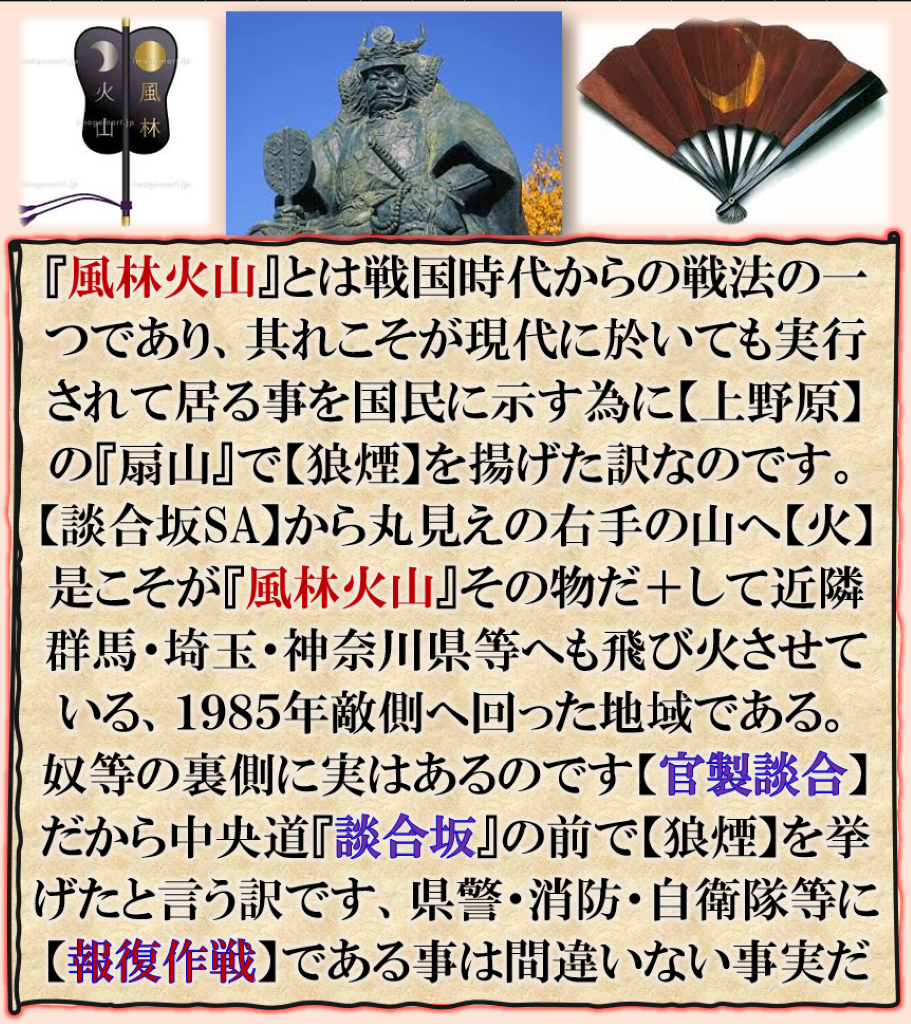 一般国民には今何が起きて居るのか理解出来て居無い筈だから説明が居る『変伝処』として説明をせよと言う事らしいぞ、当然号外扱いです、本件を見て皆様が理解出来るか如何かなのだが、発火場所は『扇山』平和な時には其れでいいのだが、戦時体制に成れば扇では無く似て居は居るのだが、【軍配】が出て来る訳です、だから【談合坂SA】脇の山で【狼煙】を挙げたのです、コスプレ警察・自衛隊等に報復作戦で或る、つまり今【日本国】は闘いの真っ只中に居る事を自覚して下さい、敵はそうなんです【コスプレ警察】や【コスプレ自衛隊】そして【コスプレ救急隊】もあるらしいぞ、国民の皆様万一『有事』の時に其の【コスプレ部隊】が動き出したら、如何するの❓是は冗談や脅しでは無い、子供達にどう教えるかが問題になるのだが、大人の皆様は事前に理解して置いて下さい、その為に年明けてから急に【コスプレ部隊】が使用する衣装が既に大量に日本国内に入荷して居ると言う報道が出て来ました、今朝のTV,でも放映して居ました、つまり国民に【警鐘】を発信して居るのです。 sy