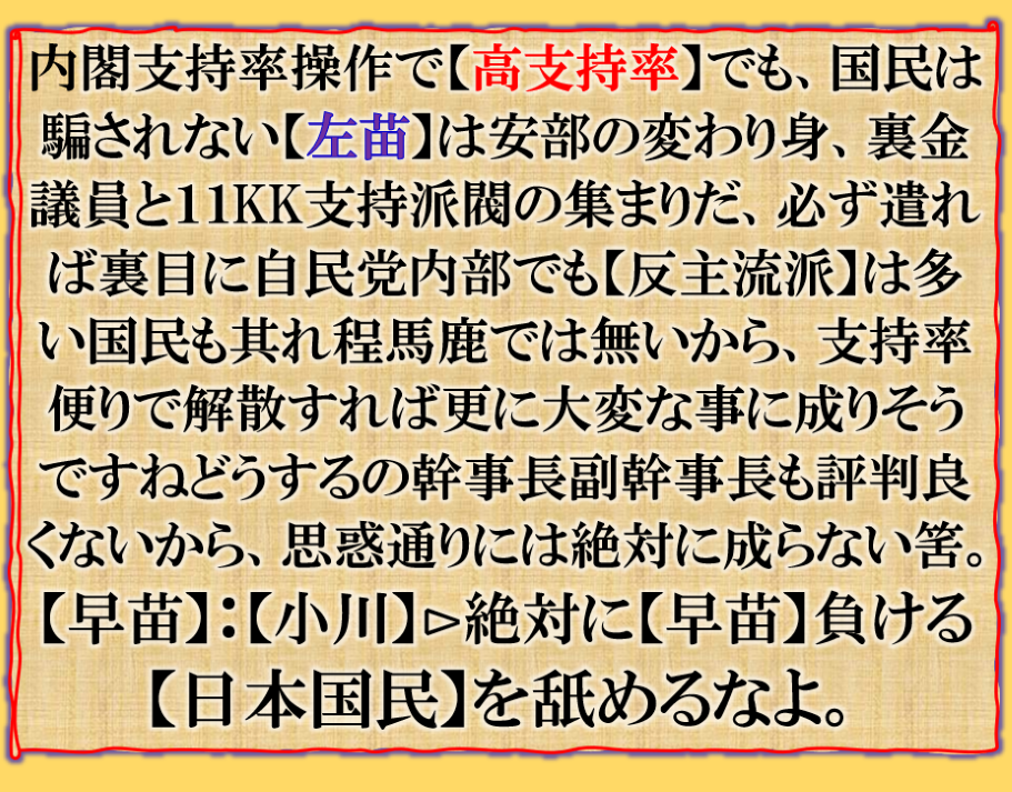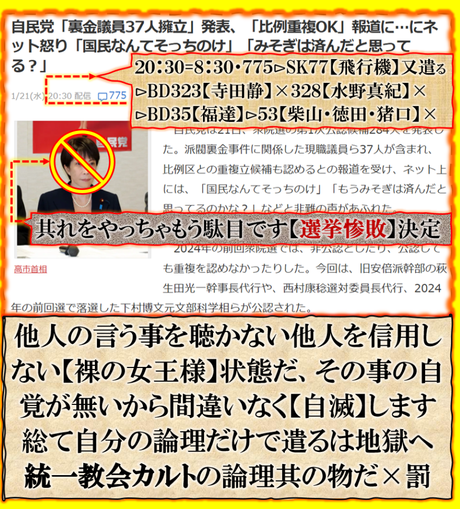【11KK】は必要だが【学会】は要らない、それが【高市傀儡政権】の誕生だった、裏金議員は絶対に必要だが、自民主流派=安部派以外は要らない❓反主流派は自民を離れるかも知れない、解散総選挙は完全に【自民解体】への扉を開ける事に成るかも知れない。【毒苗】は裸の王様、その様な背景を全く理解して居ない、内閣支持率が異常に高いのは【早苗】人気が高い事を国民が認めて居るからだと思うらしいが違います【傀儡系メディア】等に依るイカ様【指示率】であるからです、つまり解散等やれば其れこそ【自民党崩壊】の扉を開ける事に成る事を何時理解するのか目を覚ませ【自民党】このままでは歴史が終わります、遂に3流国家への坂道を転げ落ちる自己崩壊前夜の様相ですが、【毒苗】さん解って居るのか❓ sy