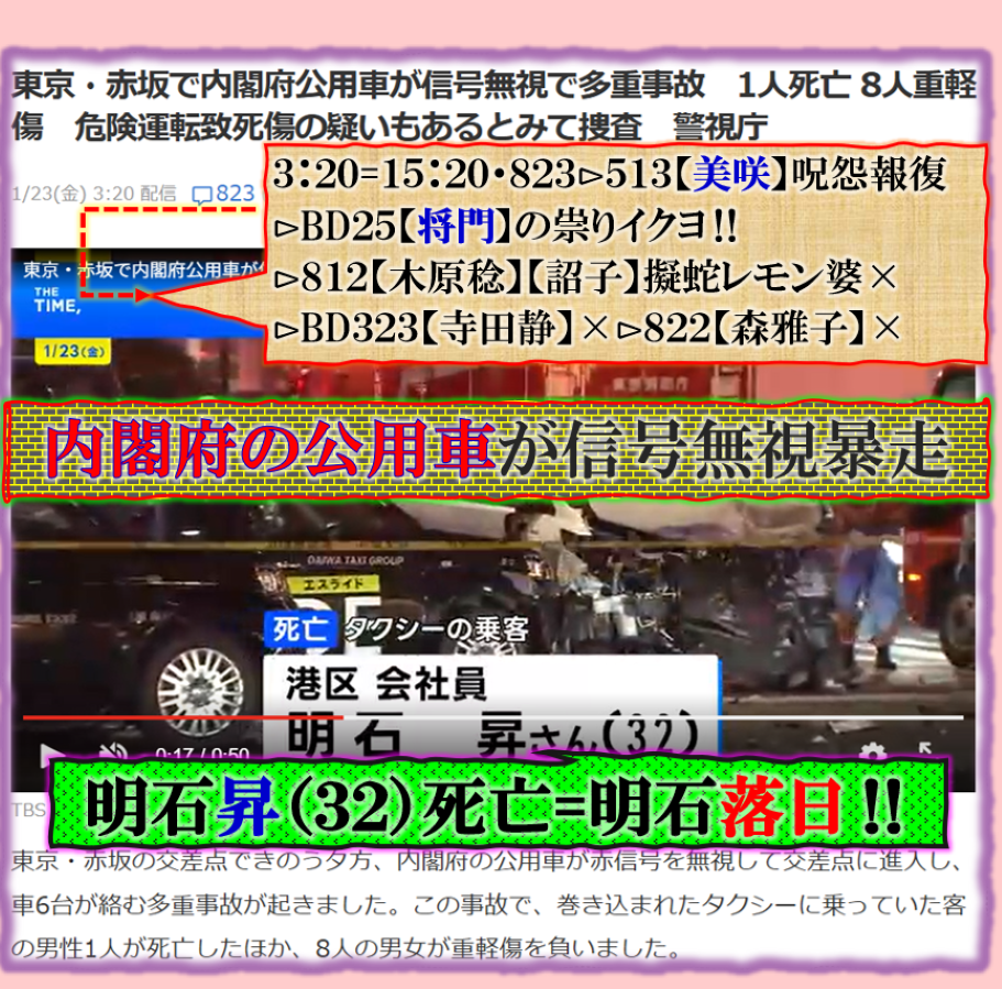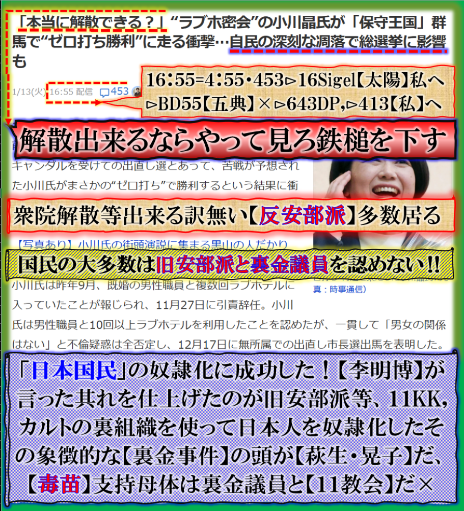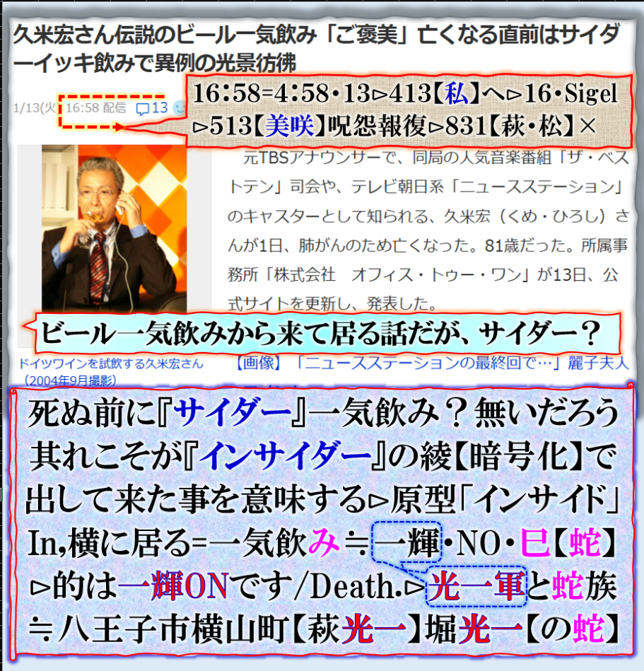 【一輝】≒光の一軍が飲み⊳NO【巳】蛇年を意味する人です、【ので蛇歳】=【詔子】L蛇婆の事です、一軍=萩生晃子【萩生田光一】と【堀内光一】の事です、【毒苗】政権の横に居る【闇】を示唆して来た訳です、⊳BD831【萩生晃子】【松本洋平】同じBD,ですが何時もセットで出て来ます=文科相【松本洋平】だから急に【学校内暴力事件】報道が一機に出て来た訳です、総て「歩調」が同期して居る意味は、其れを出す為に【久米宏】に『サイダー』一気飲み報道を取り上げました、当然奥様のコメントとありますが、絶対に【捏造】です、其れを暗示させる為に【インサイダー】を飲んだ訳です、変な文法なのですが、【萩生田光一】の八王子市には【横山町】中心部にあり、その隣町には【大横町】も或るのです、【大】=サイダーの【イダ】と掛けて或る訳です=【大】⊳DIE【殺すぞ】と言う意味の脅しの構図なのです。つまり【毒苗】政権中枢は完全に脅しが掛けられている訳です、【毒苗】を推した【副総理】?ヒョットコ君には全く連絡もせずに【解散決定】したらしいぞ、完全に終わります。 sy