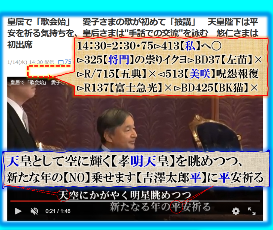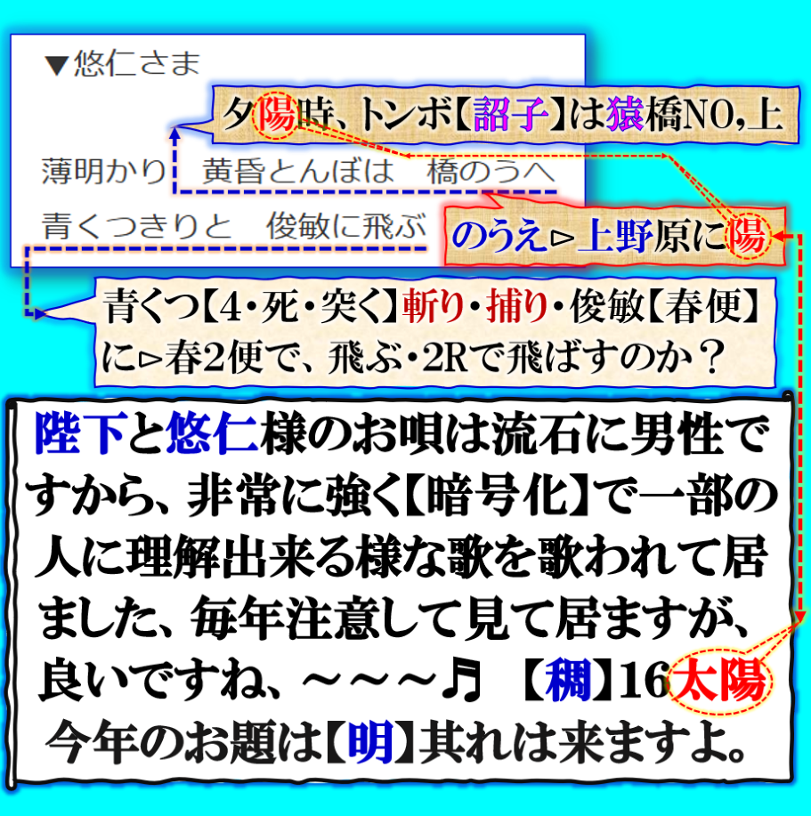 凄過ぎる~~~♬流石に【歌会始】のお題が【明】ですが、今年は特別ですね、何が特別なのかは御覧の通りです、理解出来ないかも知れませんがご覧下さい【上野原】扇山の発火事件も此処で仕込まれて居る意味を考えないと、甲斐武田【風林火山】何故燃えだしたのか❓その意味も理解出来ると言う事にも成る訳です。 sy
