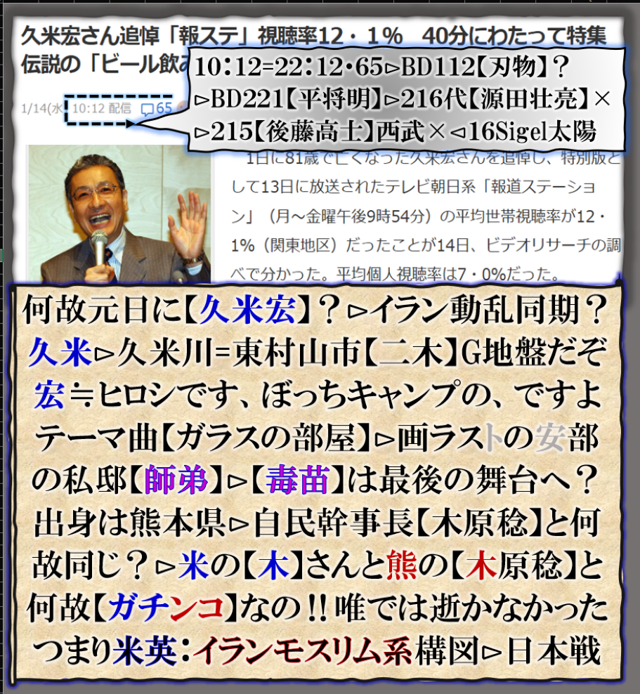 何故今【イラン】動乱が起きて居るの❓日本国内の【モスリム系】カルト組織【毒苗】旧安部派罰等に何かが起きて居る事と【同期】して居る、だからその【裏側】を暗号化で開示して来た、その暗号化で【久米宏】が必要不可欠だった、肺癌で死亡と公表されてはいるのだが、真実は解らない【死因】ば別なのかも知れない【肺炎】らしいと噂もあった様な気がして居たのだが公開では【肺癌】だと❓・・・つまり【高市・毒苗】がガンだから、HIGHガン≒高い位置ハイがガンだと言う意味で、恐らくだが【肺炎】誤情報も流して来たのだろうと思いました。だとするならば確実に【解散総選挙】は惨敗する筈です、引責辞任の構図シナリオが出来ているのかも知れません、政界永田町の一寸先は【闇】ですから、全国民が其れを見る事が出来るのかも知れません、凄い事です。【旧安部派】&【裏金議員】が完全に終わります。開票日迄待てません、速く遣って。 sy