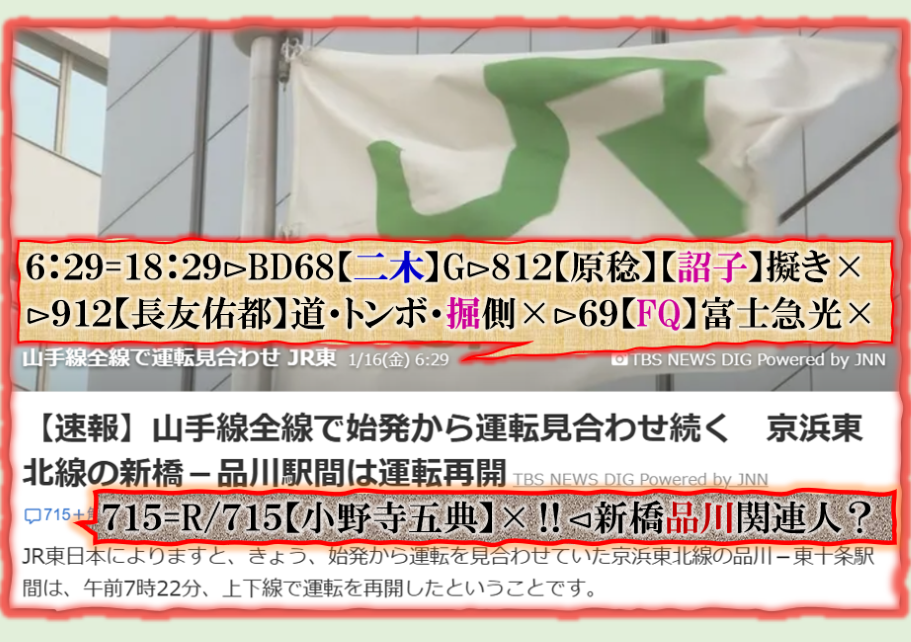 この事件の背景に一体何が?⊳山手線≒山へノ・ダブル十字・戦の事かな?⊳のの山≒上野原の山【扇山】へ狼煙と話が同期して居る事と無関係では無い、だから【山手線】中心に全線止めたのかも知れない。 sy