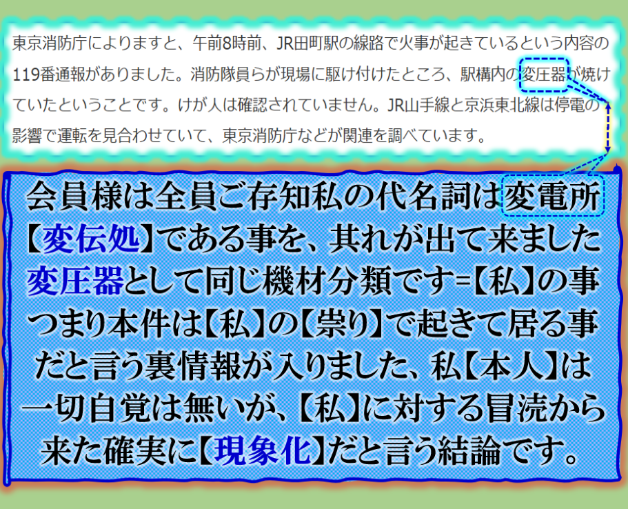 是は戦争です、【変圧器】【変電所】は私の代名詞です、その事は皆様ご存知です、何故此処で【私】が出て来るのか❓【私】の仕事を邪魔する奴等、更には妨害冒涜する奴等に対して【警告】なのです、このまま続ければ更に重大な事態に突入する事を警告して来た、其れを奴等が理解出来なければ意味は無いのだが、【変伝処】が文節変換して伝えなさいと言う事らしい。【水上の黒焼き事故】と【上野原】扇山【発火事件】とも連動して居ます、狙いは甲斐山梨だと言う事でもあるかも知れない。 sy