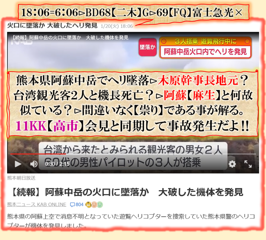 確実に【祟り」です、萩生晃子台湾訪問=高市政権幹部に対して【祟り】として台湾観光客を火口に堕とした、結果的にそうなる訳ですが、一般人には間違いなく偶然だと見えるのかも知れませんが、違います【確実に祟り】であり、【麻生君】の怒り心頭ぶりが良く見える事件です。 久し振りにインフルに遣られました、2日間寝たきり発熱で意識朦朧???きつかった。 sy