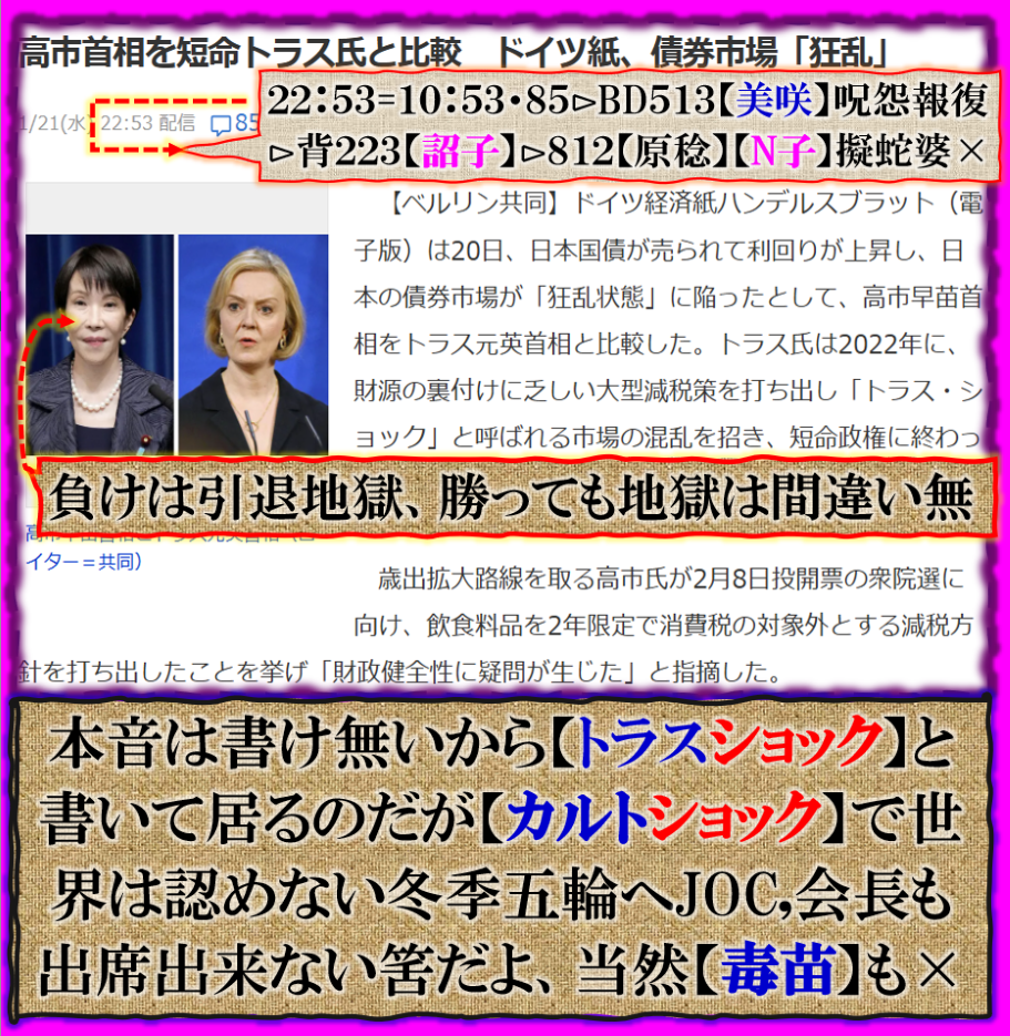 選挙遣る前から負け決定している様子が良く見えるのですよ、~~~♬だから驚きベルリン共同からのレポだが、是こそ【其れらしく】書いて居る【ショック】の意味とは実は違って【カルトショック】を出して居る訳です。丁度この時期コルチナ冬季五輪にJOC,から誰か行くのか❓誰も行けない❓【EU】は反カルト法が適用されて居るからカルト系議員は誰も入国出来ません、当然【選手】もです、もしかすると【選手】の中でも是から急に出場辞退する人すら出て来るかも知れません、【カルト国家】日本国の是が現実問題なのです。 sy