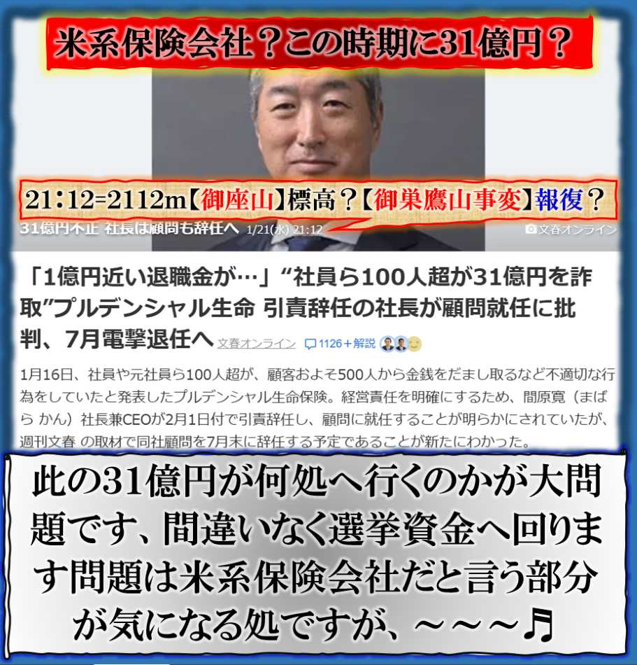 この事件の実態は誰も知らないが31憶円の数字だけは明確【確定】して居る訳なのか?選挙の年には必ず何らかの【金融事件】が起きる物なのです、当然其れが【選挙資金】へ回るのです、政界と金融界との関係なのだろう、問題はこの資金が何処の政党へ回っていくのか❓其れが気に成る訳なのです、選挙の年は【穏やか】では居られません。 毎回何か起きますから、~~~♬ sy