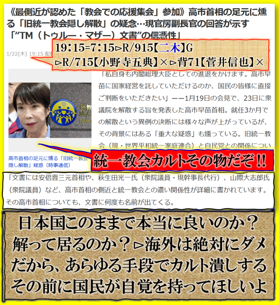 完璧な【統一教会】政権である事が明白なのだがその事すら、メディアは余り報じません、この国は完璧に【植民地】化されて居る事実も理解しなさい、その基本に立って選挙を如何するのかを考えなさい、その意味で考える時間を与えずに即選挙へ持ち込んだのは【カルト隠し】日本人の奴隷化に成功した隠しの為に急いだ訳です。 sy