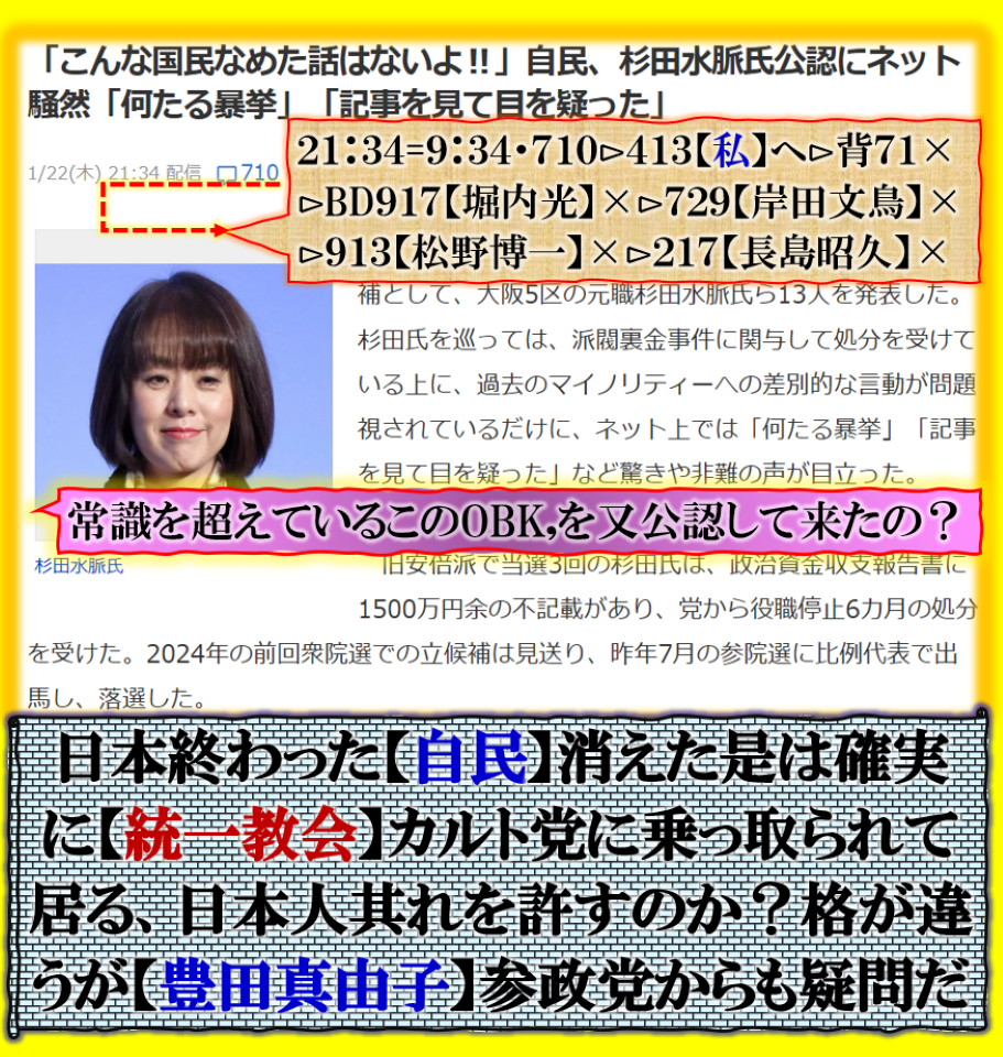 その事が此処で出て来る意味は其れとして読み取れる訳です、総て【禊】は終わった事だから、【裏金議員】等と言う言葉すら無く成ったと言う考えなのか❓国民を馬鹿にし過ぎて居無いか❓【愚か者めが】~~~~絶対に許さないぞ、必ず叩き潰せ。 sy